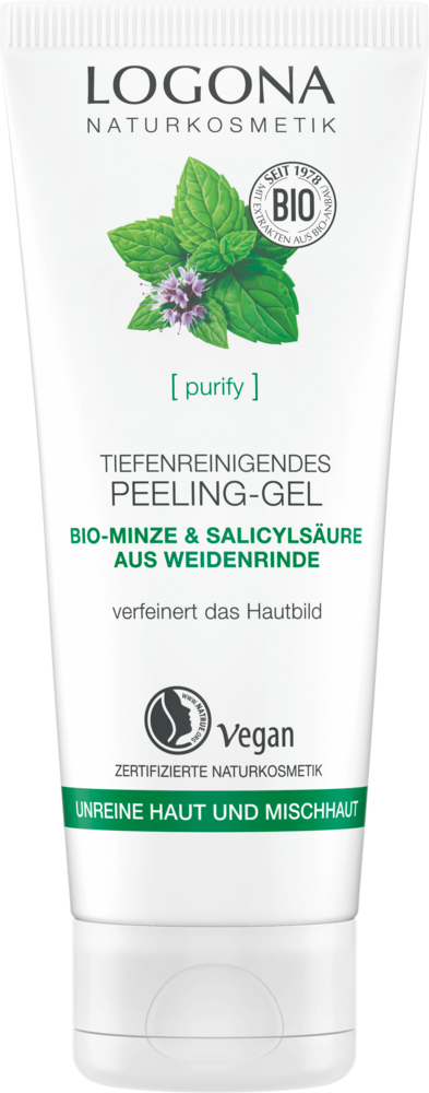 Das LOGONA TIEFENREINIGENDE PEELING-GEL verfeinert und erfrischt das Hautbild. Die effektive Formulierung mit Bio-Minze, natürlicher Salicylsäure aus der Weidenrinde und Peelingkörpern aus wertvollen Jojobaperlen und natürlicher Kieselerde peelt sanft und befreit die Haut porentief von abgestorbenen Hautschüppchen, Unreinheiten und Schmutz. Geeignet für die Haut in der Pubertät und für zu Unreinheiten neigende Haut.