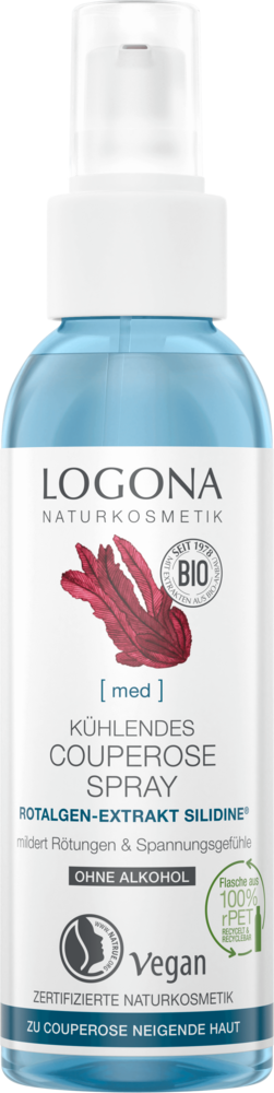 Das LOGONA KÜHLENDE COUPEROSE SPRAY beruhigt die Haut und schafft schnelle Linderung bei Spannungsgefühlen – auch für unterwegs. Das feuchtigkeitsspendende Spray mit dem exklusiven Wirkstoff SILIDINE® aus der Rotalge stärkt die Gefäßwände, erhöht ihre Spannkraft und lindert Rötungen langanhaltend. Besonders sanft. Ohne Alkohol.