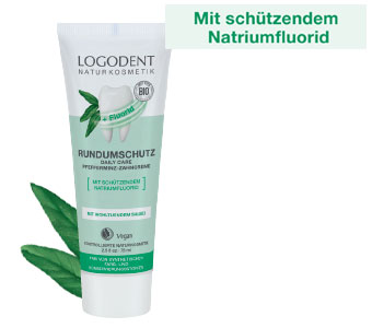 In vielen der LOGODENT Zahncremes und -gelen ist bewusst auf den Inhaltsstoff Fluorid verzichtet worden, da eine gesundheitliche Gefährdung durch eine erhöhte Einnahme in der Wissenschaft kontrovers diskutiert und ein Angebot fluoridfreier naturkosmetischer Zahnpflegeprodukte erwartet wird. Dennoch kann bei sehr empfindlichen Zähnen von Erwachsenen ergänzend ein fluoridhaltiges Zahnpflegeprodukt sinnvoll sein. Zahnexperten empfehlen zudem zur effektiven Wirkung der Kariesprophylaxe Zahncremes mit einem Natriumfluoridanteil zwischen 1.000 – 1.500 ppm. Die LOGODENT Zahncreme Rundumschutz enthält eine Menge von 1.450 ppm Natriumfluorid (1.450 ppm = 1.450 mg/kg Zahncreme). Diese Menge ist laut der Kosmetikverordnung unbedenklich. Diese hat für Erwachsene einen Maximalwert i.H.v. 1.500 ppm Fluorid in den Zahncremes festgelegt.*
